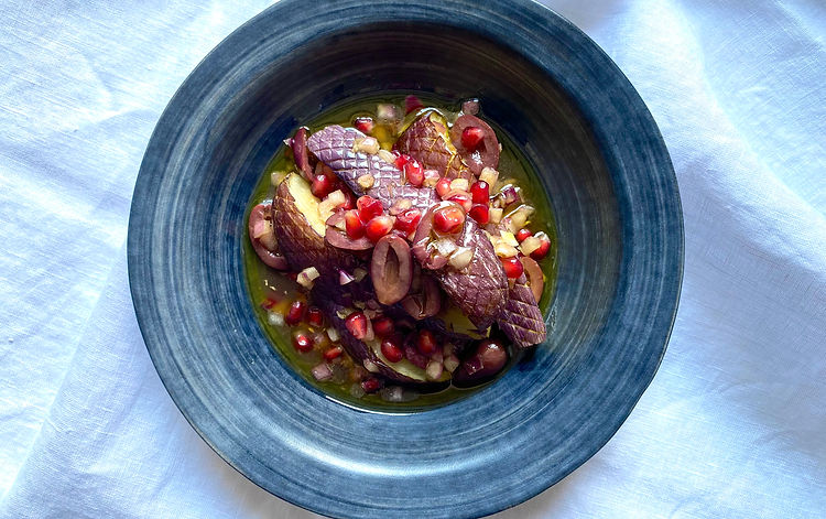 基本: 皿に茄子を並べ、その上からマリネ液をかけます。赤玉ねぎ、ざくろ、オリーブを彩りよく散らすと、華やかさがアップします。