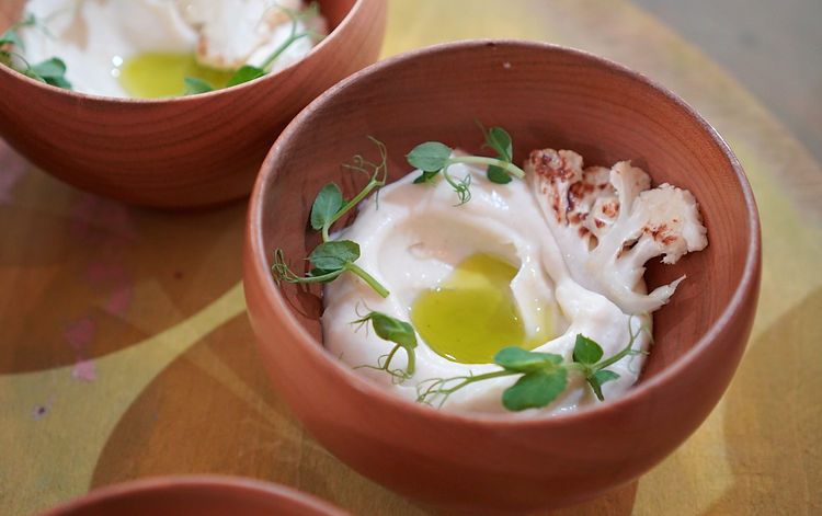 ムースを小さな器に盛り付け、真ん中にくぼみを作り、そこにたっぷりオリーブオイルを注ぎましょう。焼いたカリフラワーとハーブを添えることで、立体感と彩りが生まれます。