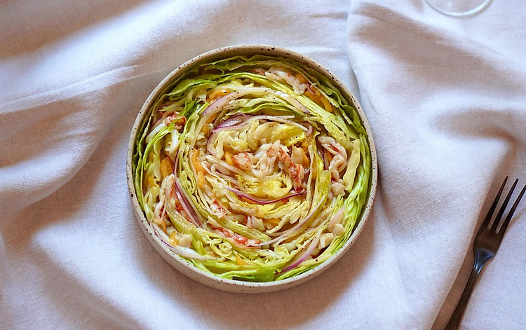 器の形を活かして、レタスとマリネを交互に重ねていくのがポイント です。まるでケーキのように美しく、食べる前からワクワクしますね。