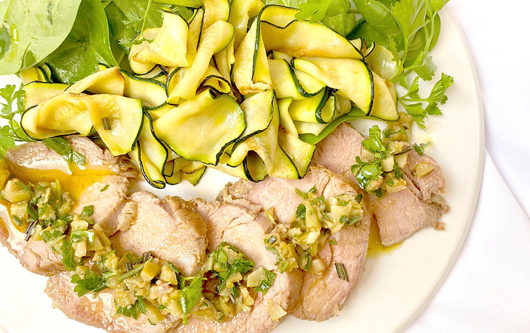 ローストポークを厚めにスライスし、焼いたズッキーニや葉野菜と一緒に盛り付けると、彩りがきれいに見えます。