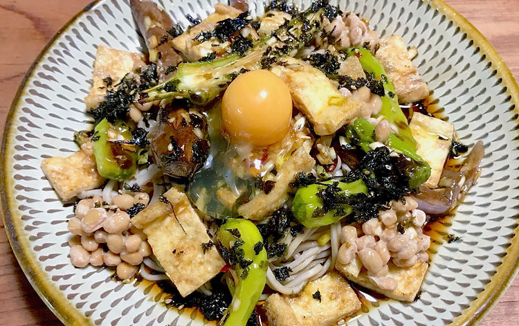 器に蕎麦を盛り付け、その上に炒めた野菜、納豆、油揚げ、岩海苔などをバランスよく乗せます。