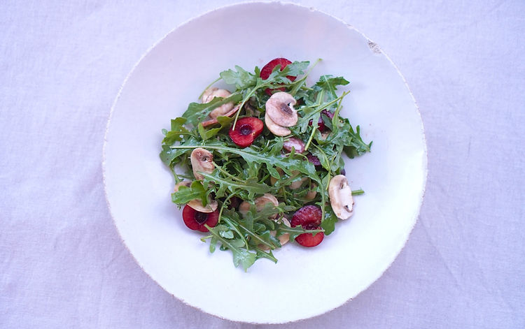 【美味しいオリーブオイルで楽しむ!さくらんぼとマッシュルームの贅沢サラダ】